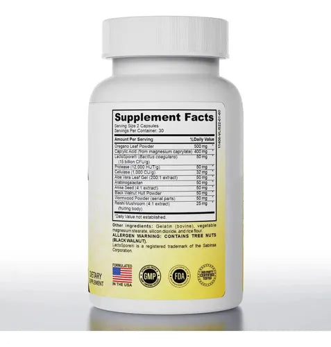 - ✅ Con extracto de ajo, orégano, nuez negra, y enzimas digestivas